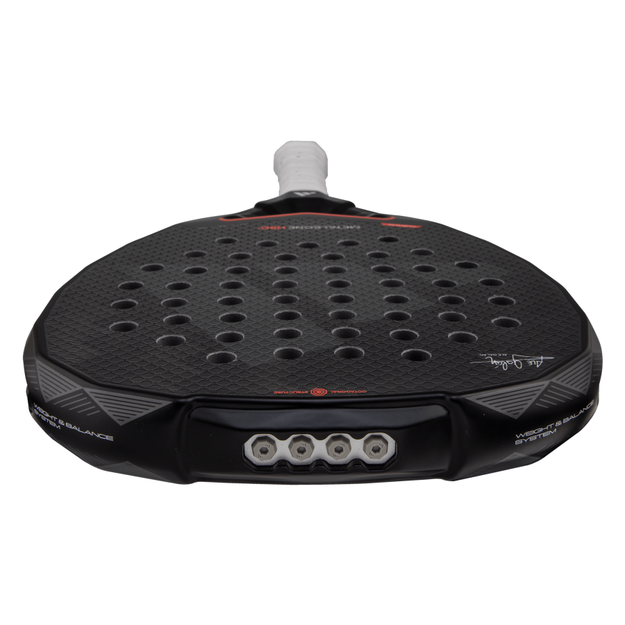 The Metalbone HRD+ 3.4 brings together all the latest power-focused technologies in one grip. Designed for Ale Galán, it delivers top-tier performance for offensive play. Additionally, the Weight & Balance System allows players to customise the racquet's weight and balance to their preference. Maximum power comes from the three new Metalbone technologies for 2025 integrated into this model. First, the extended Power Extra Grip increases inertia for stronger hits. Second, the Low Poly polyhedral design in the core and frame improves torsion resistance. Lastly, the Power Groove rail along the racquet’s side enhances overall rigidity. The Octagonal Structure frame further supports powerful impacts. Built with adidas’ stiffest materials, including High Memory EVA rubber and Carbon Aluminised 16K fibre, this racquet turns your arm into a cannon.