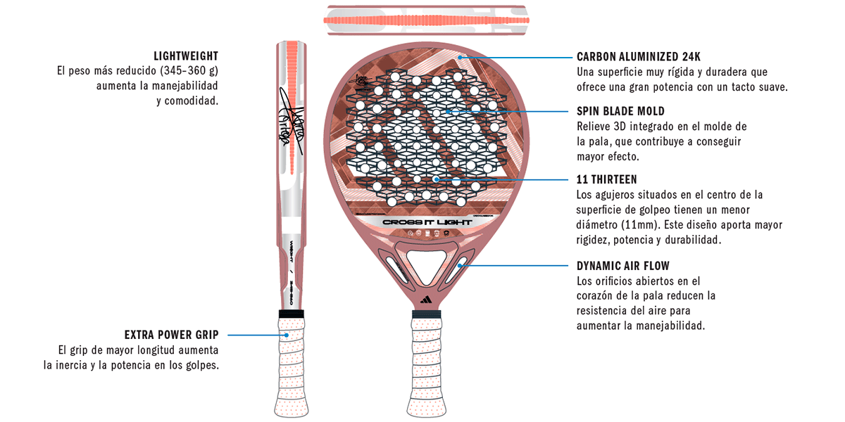 * Las tecnologías descritas en la foto corresponden a la Pala de pádel adidas Cross It Light 2026 - Martita Ortega